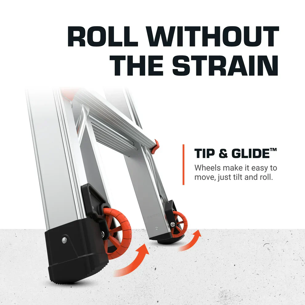 Integrated Tip & Glide wheels help you easily move the ladder from one work location to another.